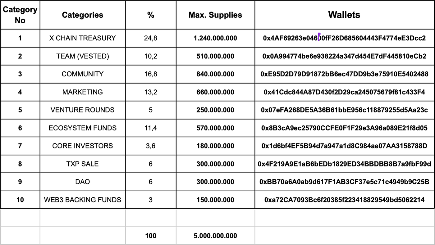 In addition, if there is a need during TGE Phase 1: For categories such as TEAM, COMMUNITY, MARKETING, VENTURE ROUNDS, and TXP PRE-LISTING (CEX/DEX) SALE, we may mint up to 136,900,000 $TXP tokens (2.74%) if necessary. However, please note that this minting is not mandatory and will only occur if there is a genuine requirement.
