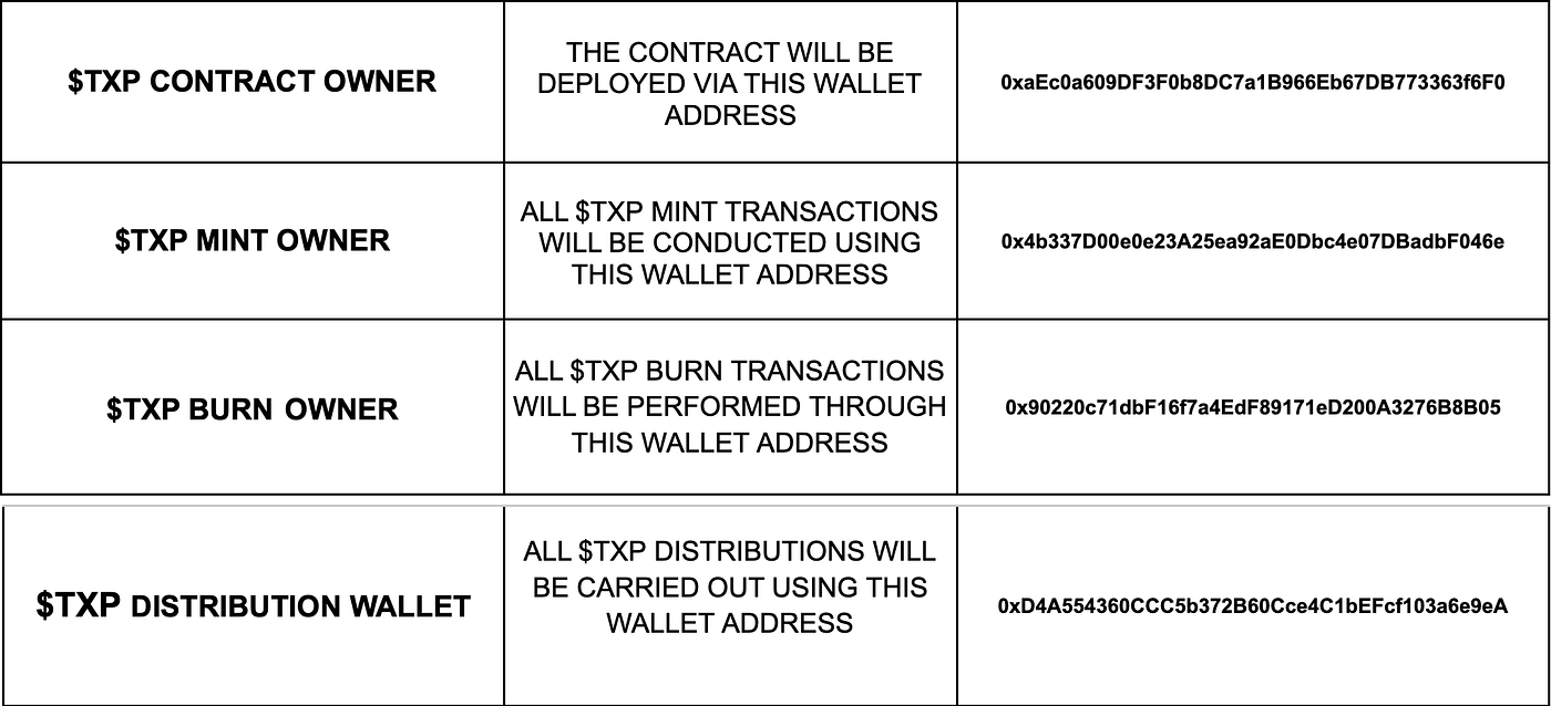 The $TXP Distribution Wallet acts as the designated wallet address for all $TXP token distributions. Its primary role is to facilitate the smooth transfer of tokens to their intended recipients based on their respective categories.