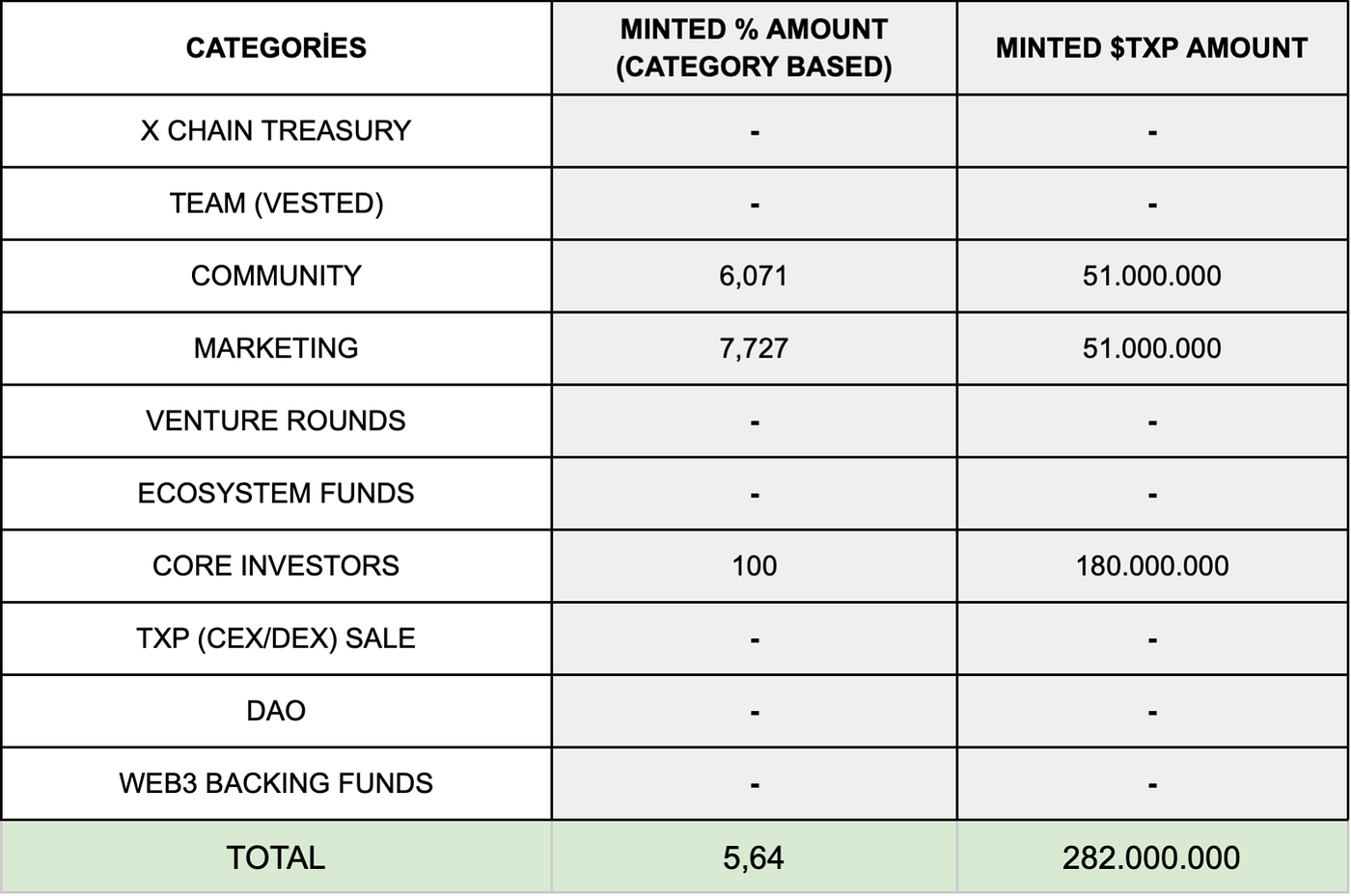 During TGE Phase 1, initially, 282,000,000 $TXP tokens will be minted, representing 5.64% of the total token supply of 5,000,000,000 $TXP